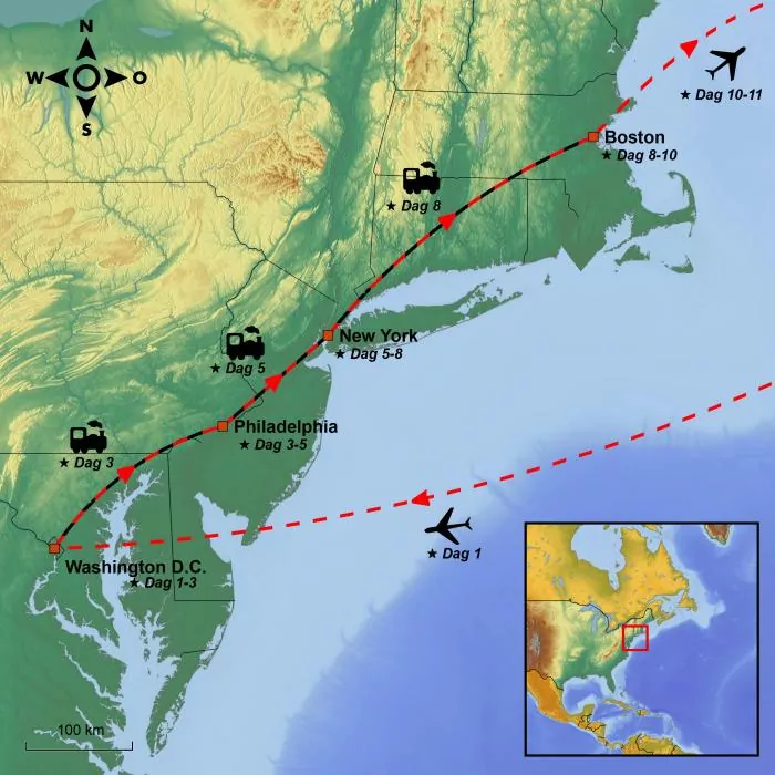 Ga met ons mee op een boeiende treinreis langs enkele van de belangrijkste plaatsen in de wereldgeschiedenis – historisch, politiek en cultureel. Het is een gemakkelijke treinreis, waarbij je stopt in het midden van vier verschillende steden aan de Amerikaanse oostkust: Washington D.C., Philadelphia, New York City en Boston.