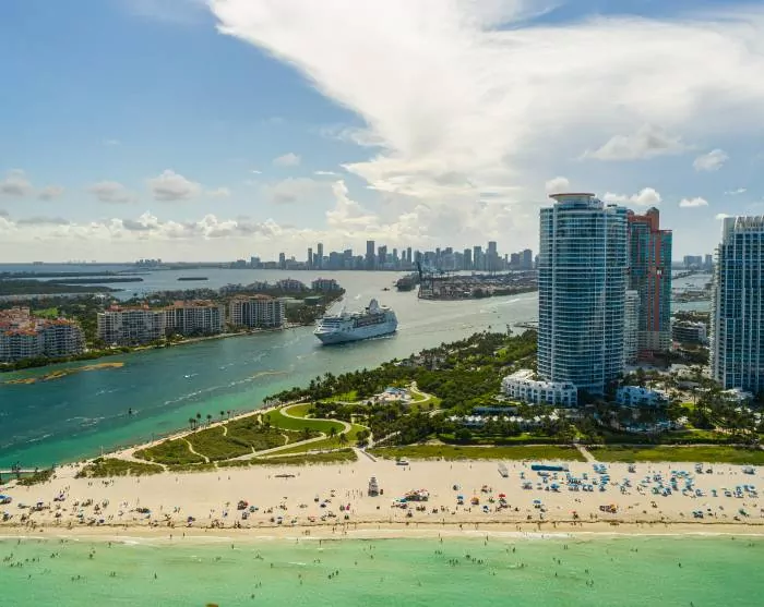 Je weet onmiddellijk dat je Miami nadert wanneer het uitgestrekte uitzicht op de oceaan wordt verwisseld door het stedelijke landschap met zijn hoge gebouwen, grote auto’s en cruiseschepen. Je verblijft in Miami Beach, dat bekend staat om zijn felgekleurde art deco-huizen, het strand en de winkels aan de beroemde Collins Avenue.