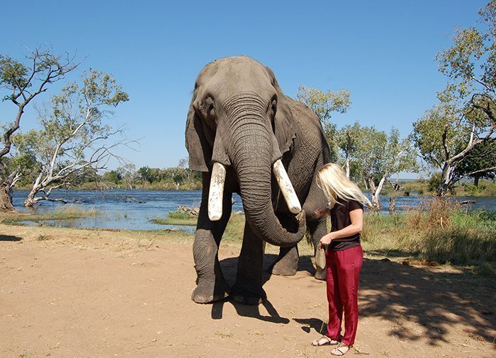 Elephant Café ligt aan de oever van rivier de Zambezi – ruim 10 km van Livingstone. Hier leven 10 olifanten die door verschillende oorzaken niet meer bij hun eigen groep horen. Sommige olifanten zijn uit de handen van stropers gered, andere zijn in gevangenschap geboren en kunnen niet in het wild overleven. Elephant Camp is hun ‘thuis’. Ze leven in principe vrij en kunnen dus gaan en staan waar ze willen, maar ze voelen zich alle sterk met de dierenverzorgers verbonden, zodat ze na een dag rondscharrelen in de bush altijd weer terugkomen.