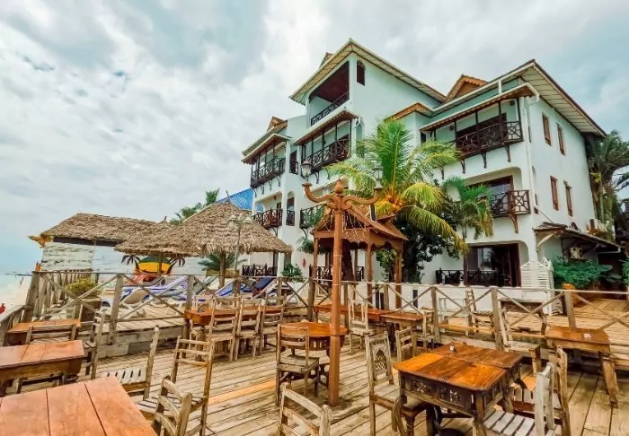 Het hotel in toeristenklasse Langi Langi Beach Bungalows ligt in Nungwi aan de noordkust van Zanzibar, aan de Indische Oceaan met turquoise water en witte stranden. U kunt hier dag en nacht zwemmen, omdat er geen eb en vloed is.
