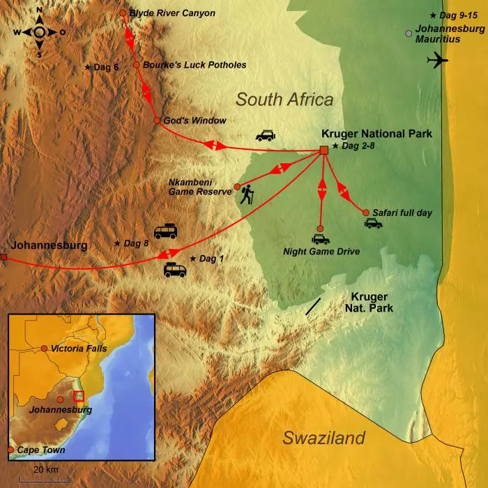 Op deze reis verblijft u in Kruger Gate Hotel, maar een paar honderd meter van de gate naar het wereldberoemde Krugerpark. U heeft de mogelijkheid om dicht bij The Big 5 te komen en u leert de signalen van de natuur kennen op een spannende bushwalk met een deskundige ranger.