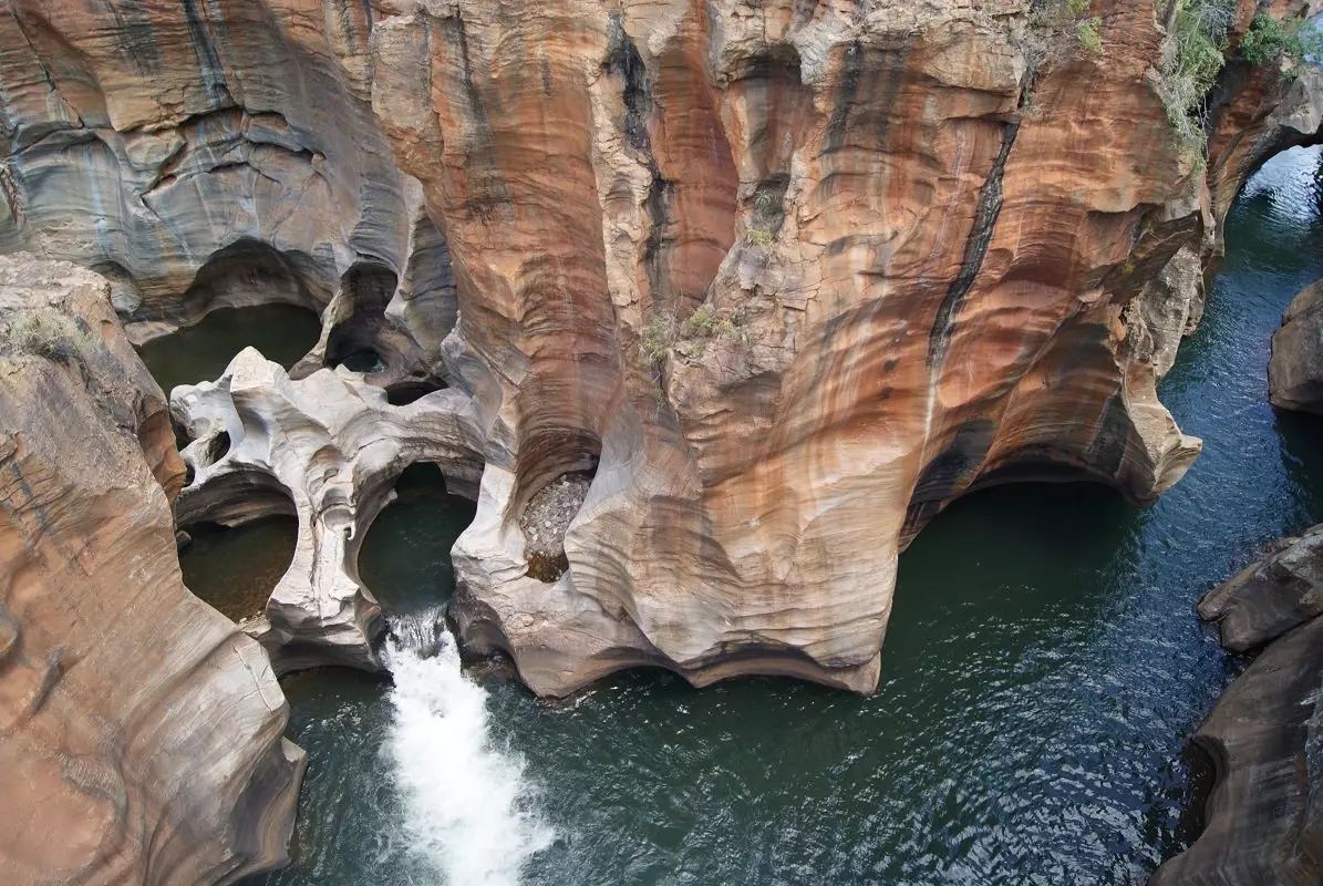 Vandaag gaat u een hele dag de Panoramaroute in de adembenemende Drakensbergen volgen. De Drakensbergen zijn rood en vormen een prachtig contrast met de groene bomen en planten. U bezoekt de Blyderivierspoort. Deze is ongeveer 700 m diep en 60 km lang en daarmee de op twee na grootste kloof ter wereld. U stopt bij de drie meest indrukwekkende uitkijkpunten langs de kloof, te weten God’s Window, de Potholes bij Bourke’s Luck en de Drie Rondavels. De Drie Rondavels zijn drie prachtige en markante rotsformaties die wat uiterlijk betreft doen denken aan de ronde hutten die vroeger veel in de dorpen in het zuiden van Afrika voorkwamen. Er zijn ook veel watervallen langs de Panoramaroute. U stopt bij een ervan. Bijvoorbeeld de Berlijnwatervallen. Het water valt hier in een 150 meter lager gelegen meer. Of misschien de Lissabonwatervallen. Deze ligt op de plek waar de rivier de Blyde zich in tweeën splitst en vervolgens langs bijna een loodrechte rots 92 m naar beneden stort. Er zijn nog veel meer watervallen. De gids bepaalt wanneer er een stop wordt gemaakt. Een van de meest spectaculaire plekken die u vandaag bezoekt, is absoluut de Potholes bij Bourke’s Luck. Gedurende duizenden jaren hebben wind en zand hier cilindrische gaten in de rotsen uitgesleten. Via bruggetjes die over deze bijzondere gaten zijn gebouwd, kunt u heel dicht bij dit natuurfenomeen komen.