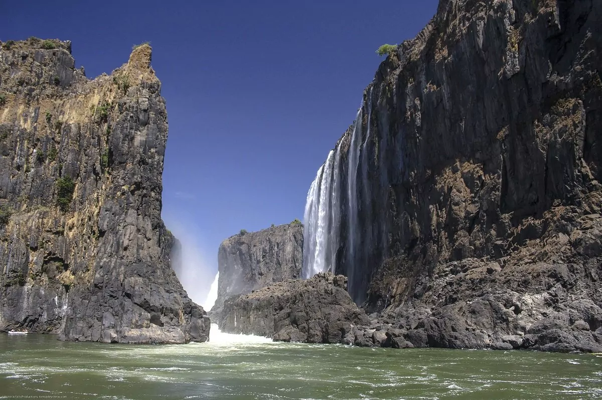 Van dichtbij zijn de watervallen bijna onwerkelijk. Per seconde stort meer dan 1000 kubieke meter 100 meter naar beneden en landt in de basaltkloven van Batoka Gorge. De watervallen zijn samen 1,7 km breed en liggen op de grens met Zambia en Zimbabwe.